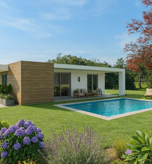 Willa inspirowana nowoczesną architekturą i śródziemnomorskim stylem życia. Prosta, geometryczna forma, jasna elewacja i duże przeszklenia zapewniają maksymalne doświetlenie wnętrz oraz płynne połączenie przestrzeni wewnętrznej z ogrodem.